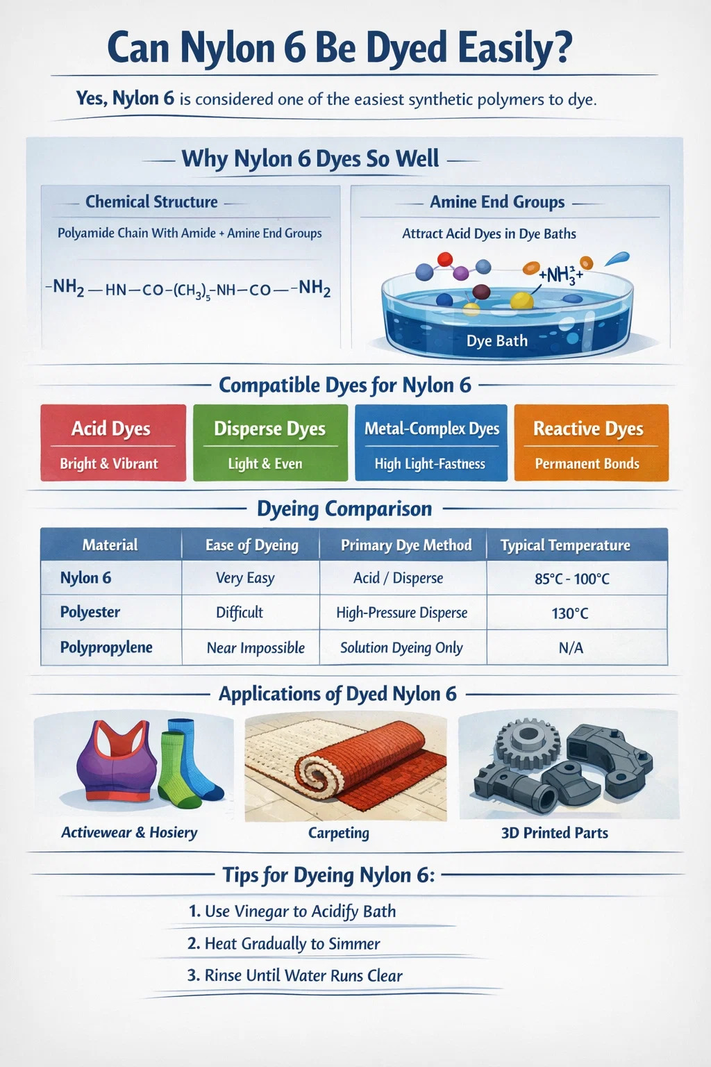 Den versatility of Nylon 6 is reflected in the wide range of dyes that can be used to color it. Each dye type offers different benefits regarding brightness and durability.