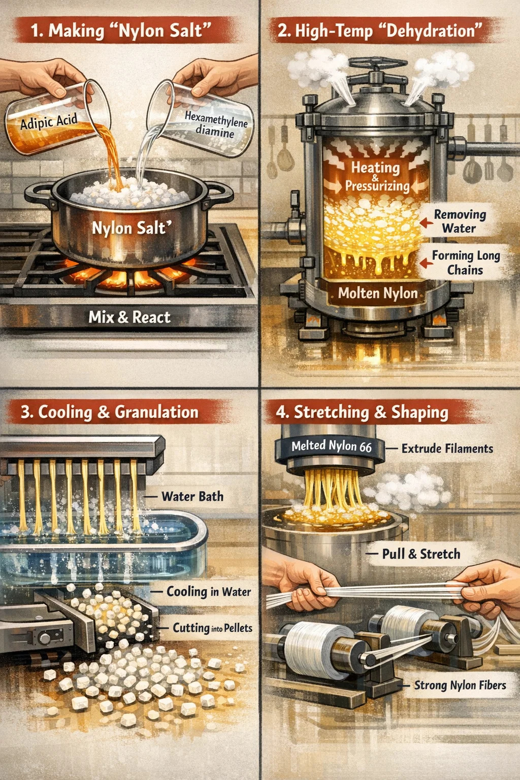 Nylon 66 , også kendt som polyamid 66, er en af de mest udbredte ingeniørplast i verden. Dens fremstillingsproces er som at "lave suppe" og "trække nudler" i et køkken, der lægger vægt på præcise proportioner og kontrolleret opvarmning.