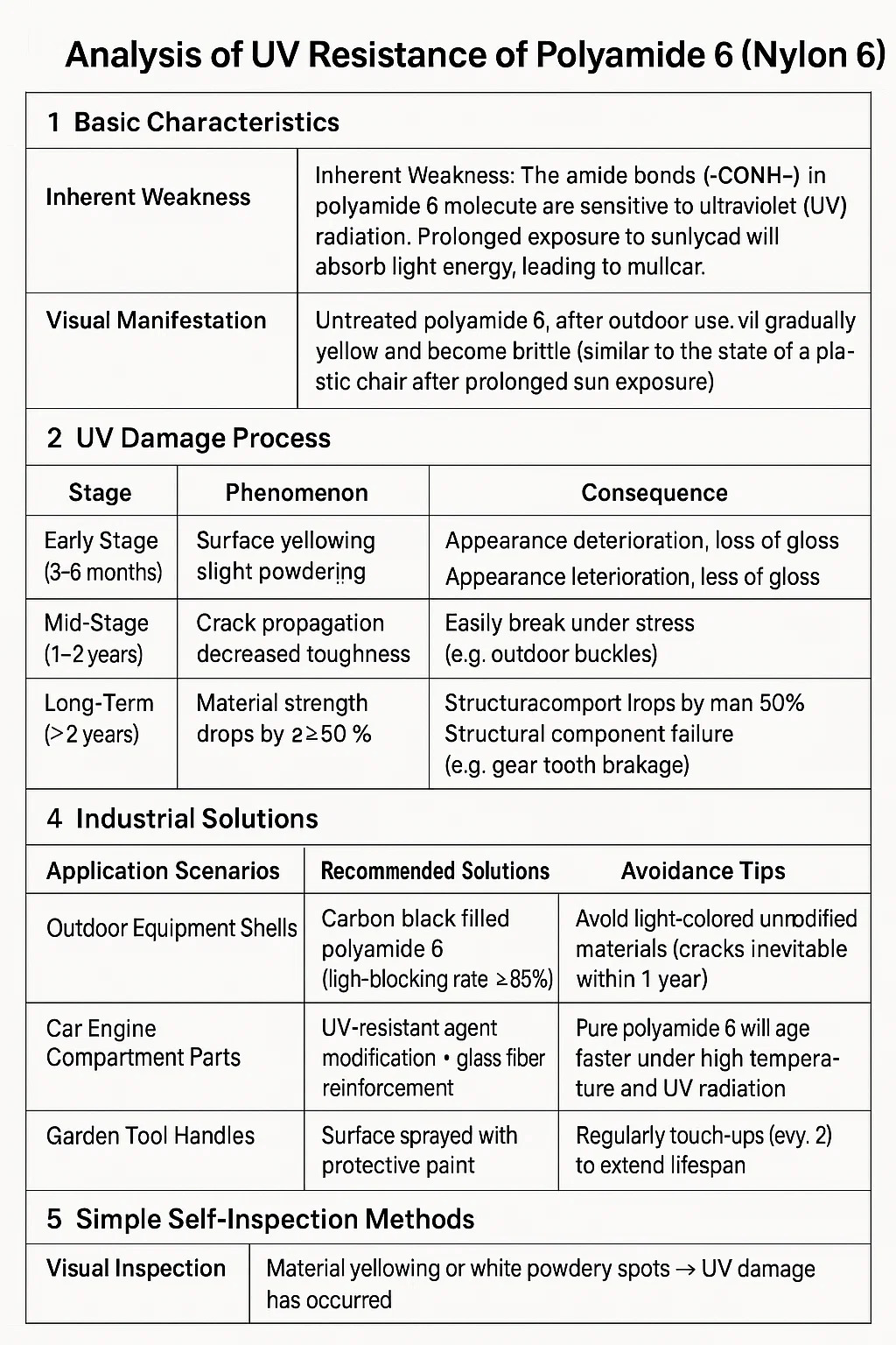 Iboende svaghed: Amidbindingerne (-CONH-) i polyamid 6-molekylet er følsomme over for ultraviolet (UV) stråling. Langvarig udsættelse for sollys vil absorbere lysenergi, hvilket fører til molekylær kædebrud.