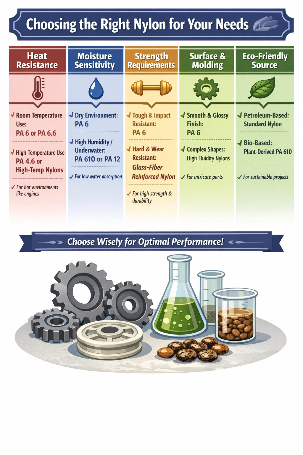 Almindelig husholdning eller almindelig industriel brug: Hvis delen kun fungerer ved stuetemperatur eller i et mildt miljø, er den klassiske Polyamid 6 eller PA 6.6 vil være tilstrækkeligt. De er omkostningseffektive og kan klare de fleste hverdagssituationer.