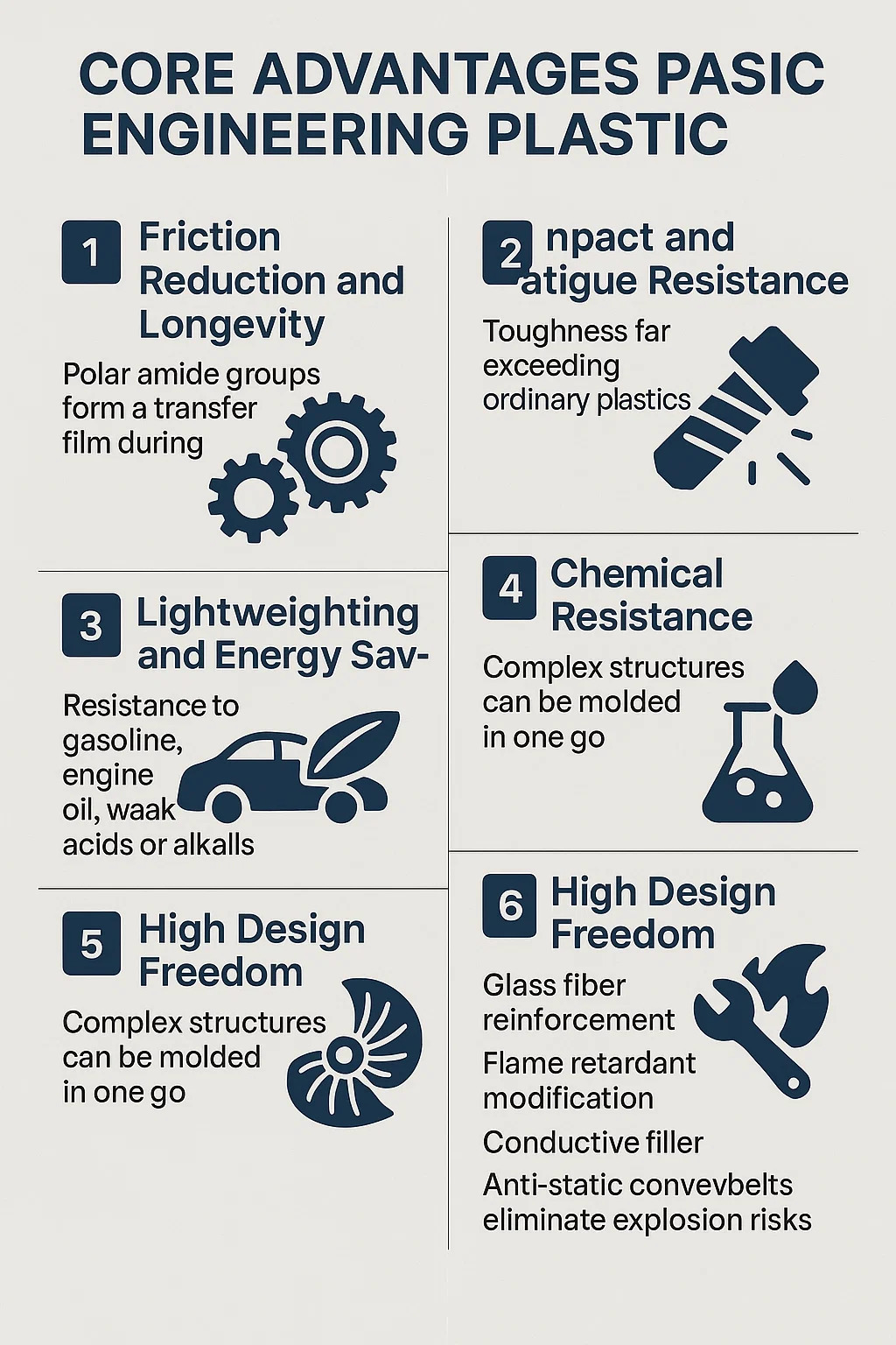 Molekylkæden indeholder polære amidgrupper, der danner en overførselsfilm under friktion, hvilket gør det muligt for gear og lejer at fungere i længere perioder uden behov for eksternt fedt. Sammenlignet med metaloverførselskomponenter reduceres støj med over 30%, og levetiden forlænges med fem gange.
