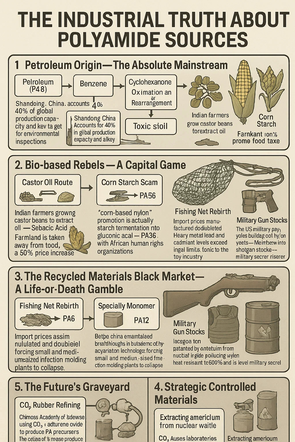 Hexamethylendiamin (PA66 -kerne): Acrylonitrilelektrolyse → Adiponitril → Hydrogenering. Processen monopoliseres af europæiske og amerikanske oligarker, hvilket resulterer i flaskehalsmaterialer og krigstid.