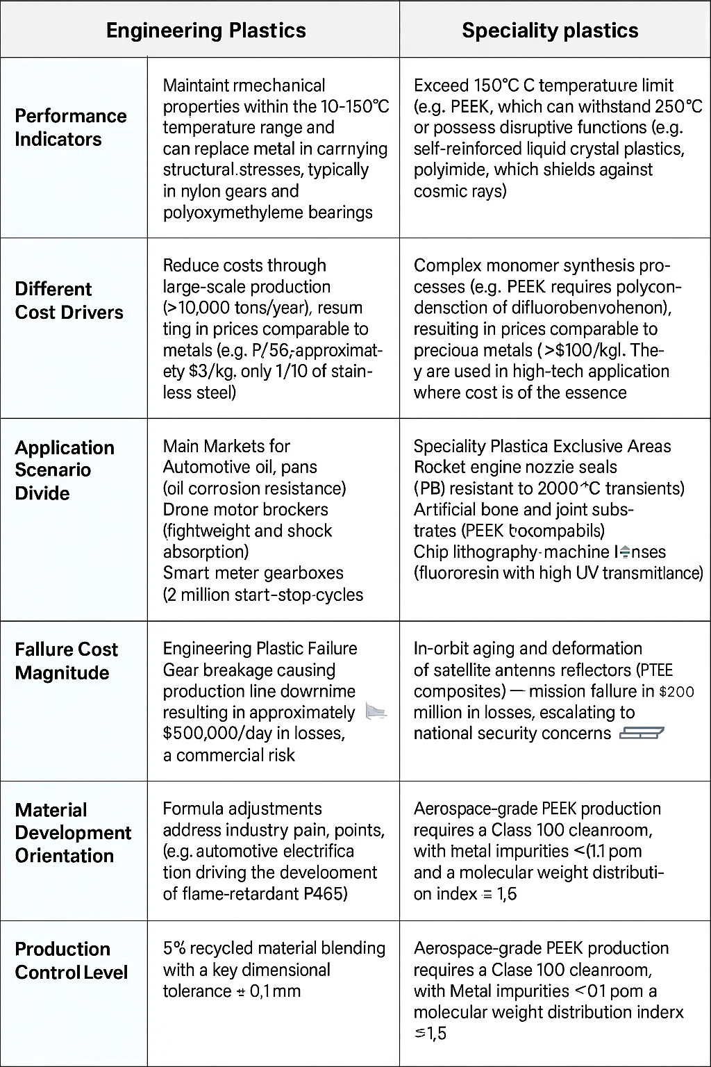 Specialplast: Komplekse monomersynteseprocesser (f.eks. kræver PEEK polykondensation af difluorbenzophenon), hvilket resulterer i priser, der kan sammenlignes med ædelmetaller (>$100/kg). De bruges i højteknologiske applikationer, hvor omkostningerne er af afgørende betydning.