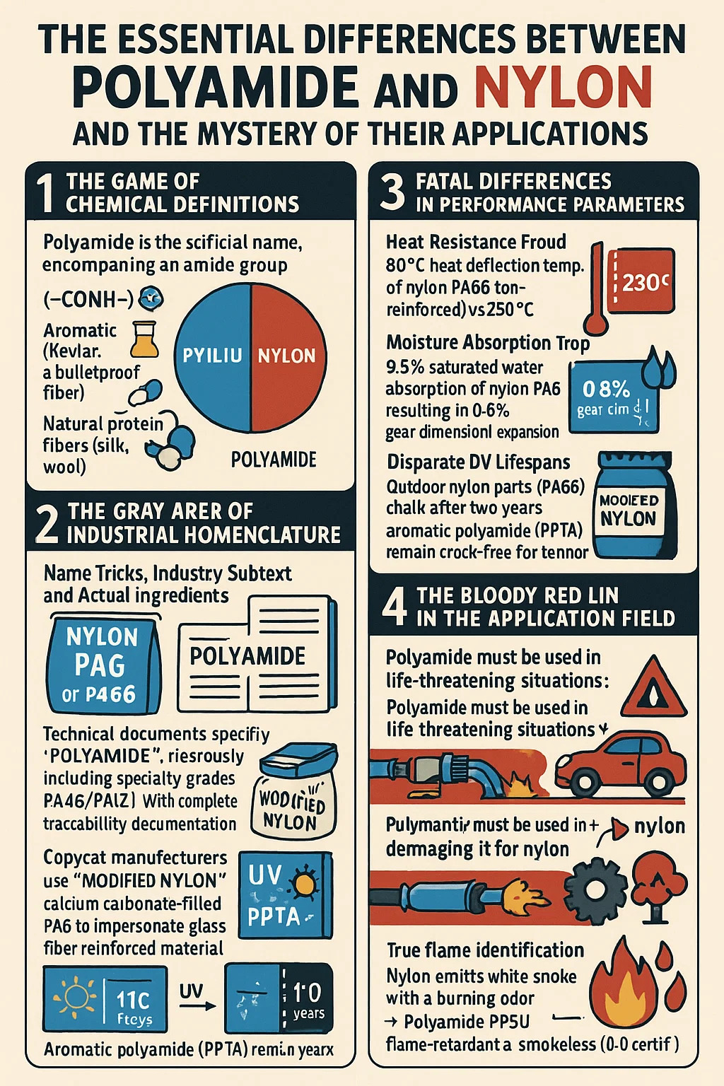 Nylon: En kommerciel betegnelse, der er registreret af Dupont i 1935 (patentnummer US2130523), der specifikt henviser til alifatiske polyamider (såsom PA6/PA66), i det væsentlige en undergruppe af polyamider.